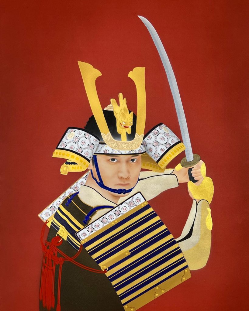 兜、甲冑を身に纏った侍、大谷翔平選手を日本画で描いてみました。